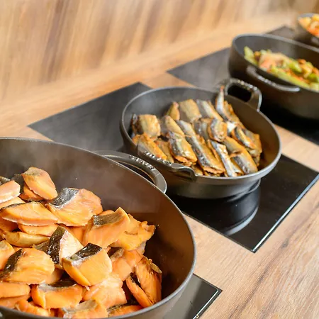 毎朝、ビュッフェスタイルの朝食をレストランで出しています。 このホテルから100メートル離れた場所にあるレストラン 八島は和食料理の各種を提供します。